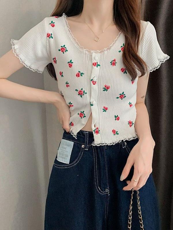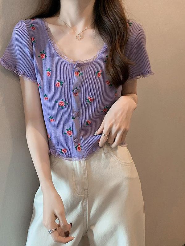Age-reducing Floral Knitted Bottoming Shirt Short Sleeve