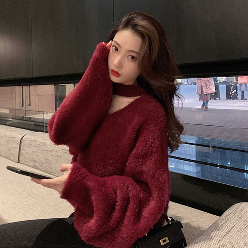 Autumn Winter Red Sweater For Women Loose Outer Wear