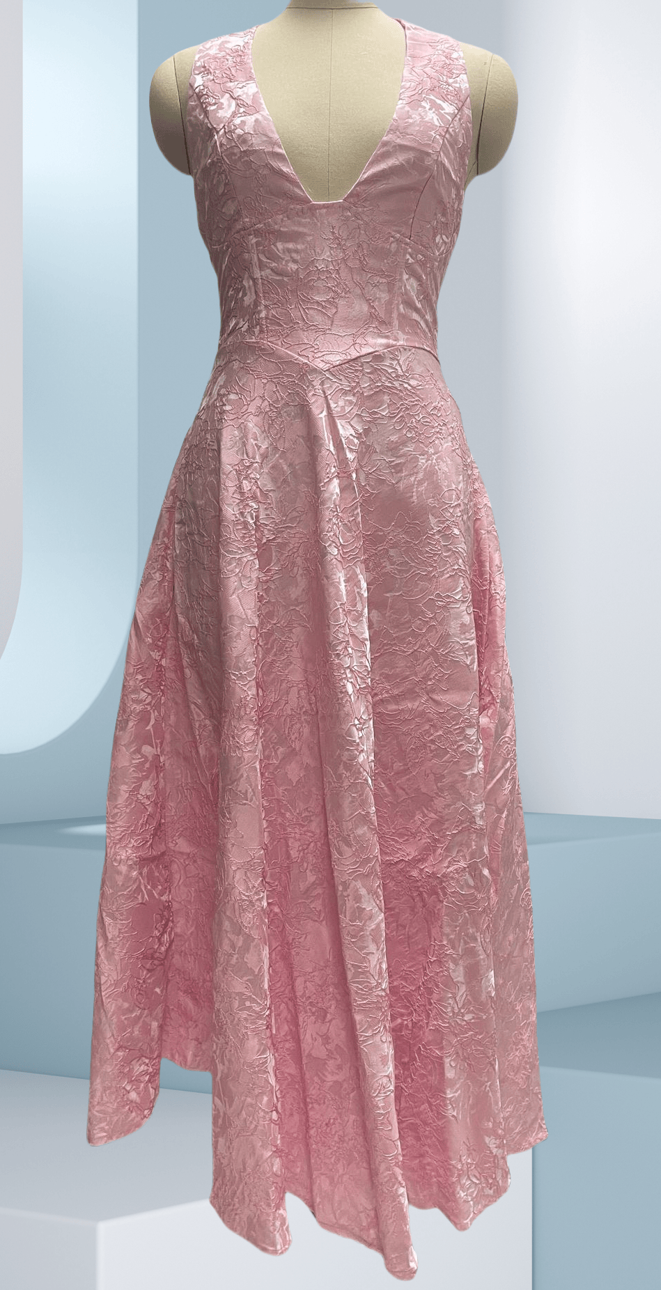 Step into the spotlight with this breathtaking jacquard evening gown that masterfully balances allure and sophistication. The intricate floral pattern woven into premium fabric creates a luxurious texture that catches light beautifully, ensuring you'll be the vision of refined glamour at any formal occasion.