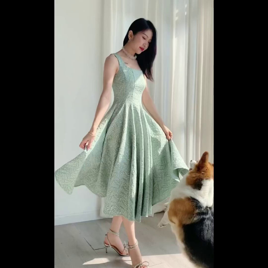 Retro Sling Square Neck Waist Dress Color Tank Top