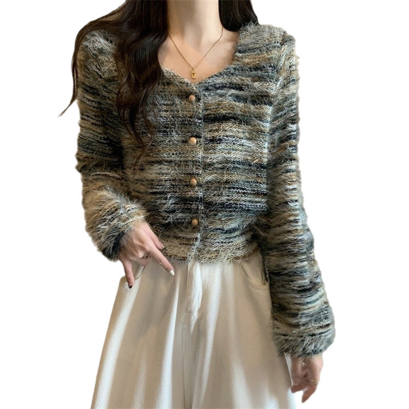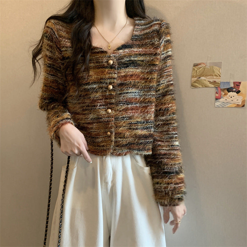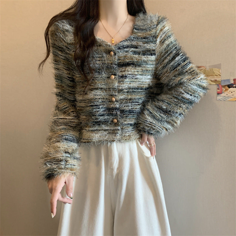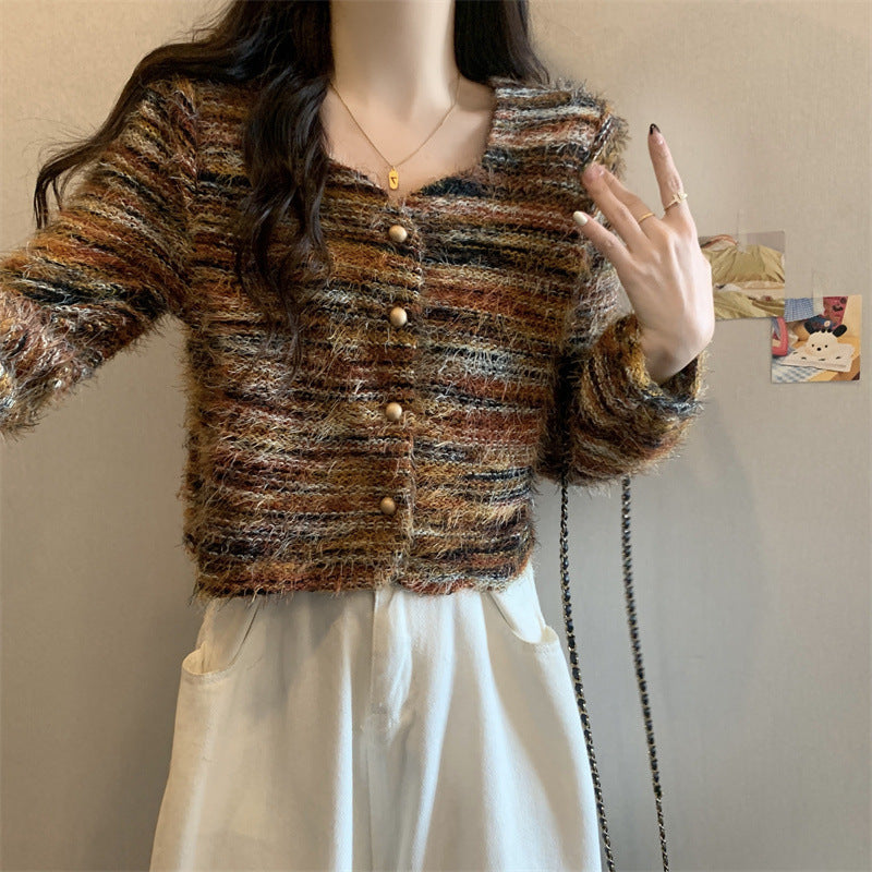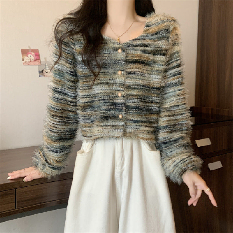 Soft Korean Style Square Collar Fur Design Striped Long Sleeve Sweater